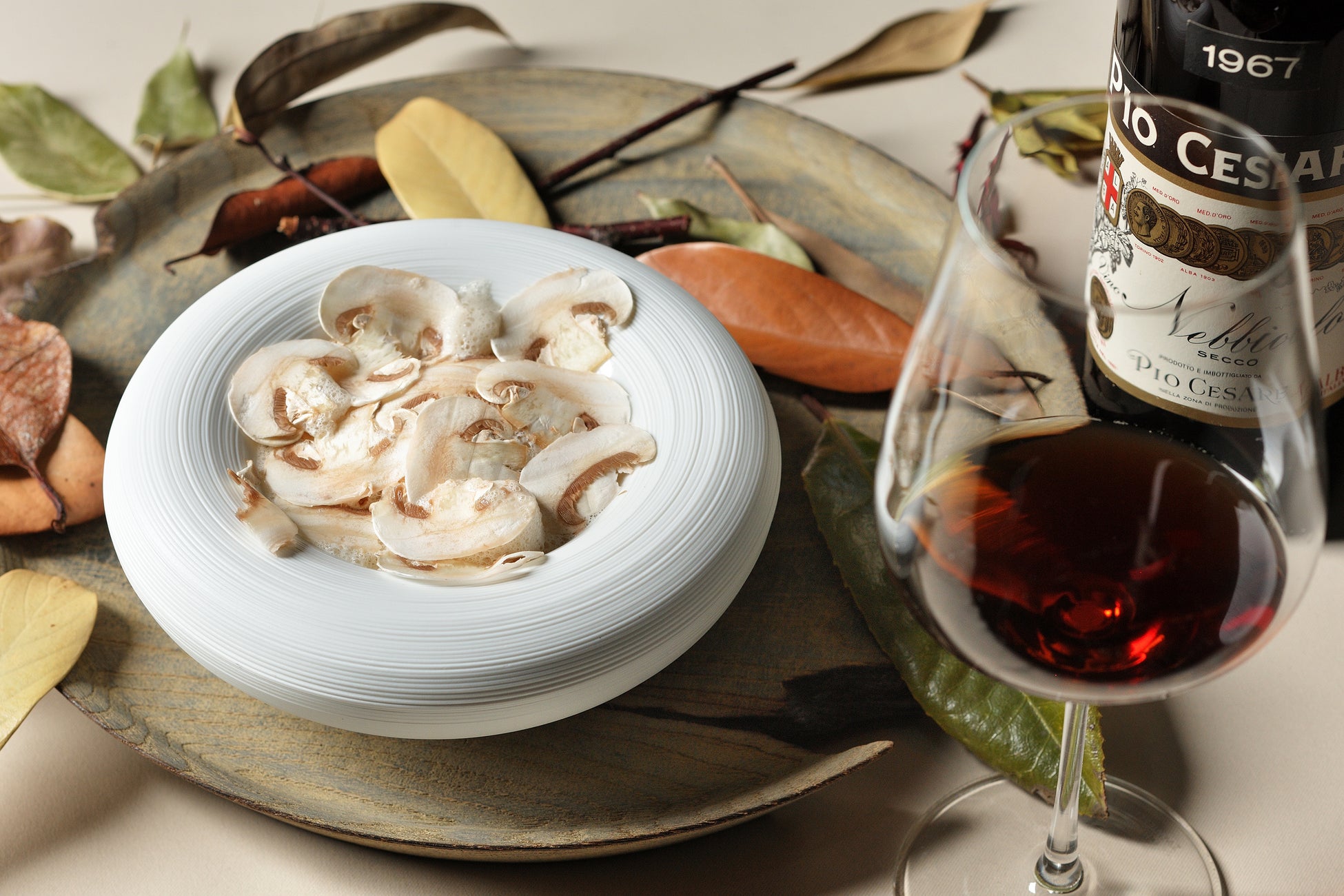 マッシュルームを味わい尽くせる温前菜に合わせるのは、イタリアのピエモンテ州ピオチェザーレの「ランゲネッビオーロ1967」です。心地良いタン二ン、そしてネッビオーロの熟成による土のニュアンスが、マッシュルームの風味や香りをさらに引き立てます。