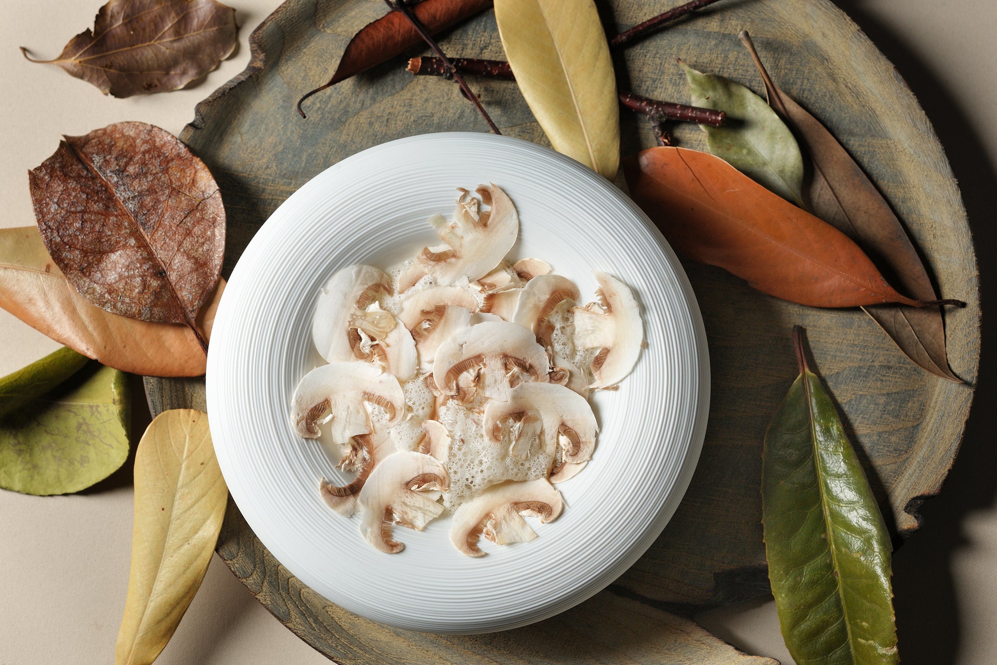 温前菜は、 マッシュルームをふんだんに使用したスフォルマ―ト(*1)です。スフォルマートは、コンソメやブイヨンで作るのが一般的ですが、この料理では、マッシュルームから抽出した旨味の詰まった出汁を使用しました。スフォルマ―トの上には、ソテーしたブラウンマッシュルーム、クルミ、マッシュルームの出汁がきいた泡をのせます。仕上げに、目の前でホワイトマッシュルームをスライスして提供します。マッシュルームの旨味や香り、食感を味わい尽くせる一品です。