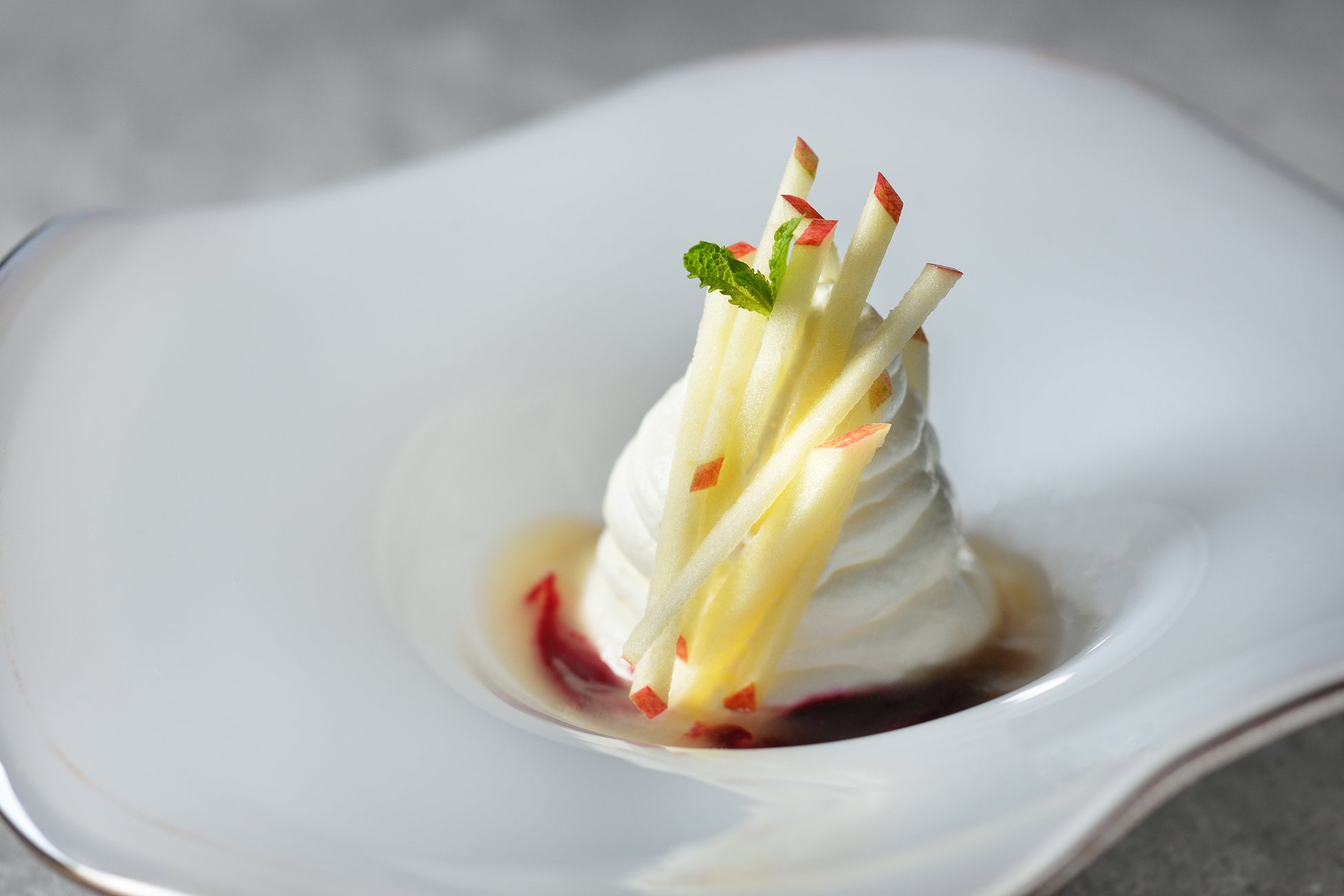 メインのデザートは、トマム牛乳(*3)から作られたヨーグルトのエスプーマに、秋に旬を迎えるリンゴをのせたドルチェです。ビーツとカシスを合わせたピューレを添えて提供します。土の風味や野菜の優しい甘みが合わさり、味に深みや複雑さが加わります。最後に炭酸のリンゴスープをかけることで、口の中で、儚く消えていきます。