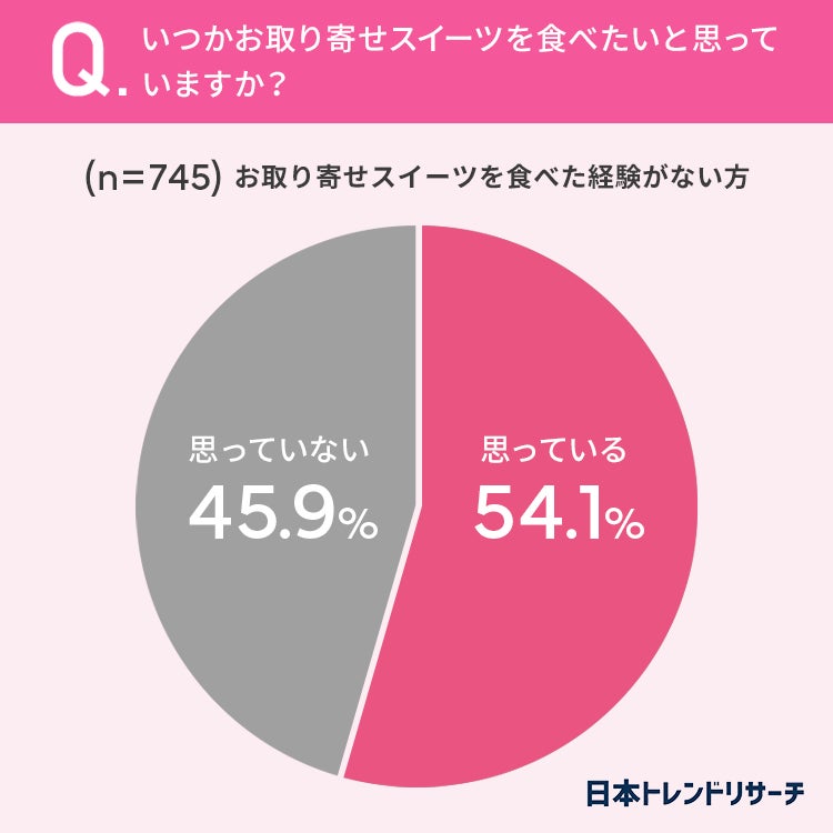 お取り寄せスイーツを食べたことのない方の54.1%が「いつかお取り寄せスイーツを食べたいと思っている」と回答しています。