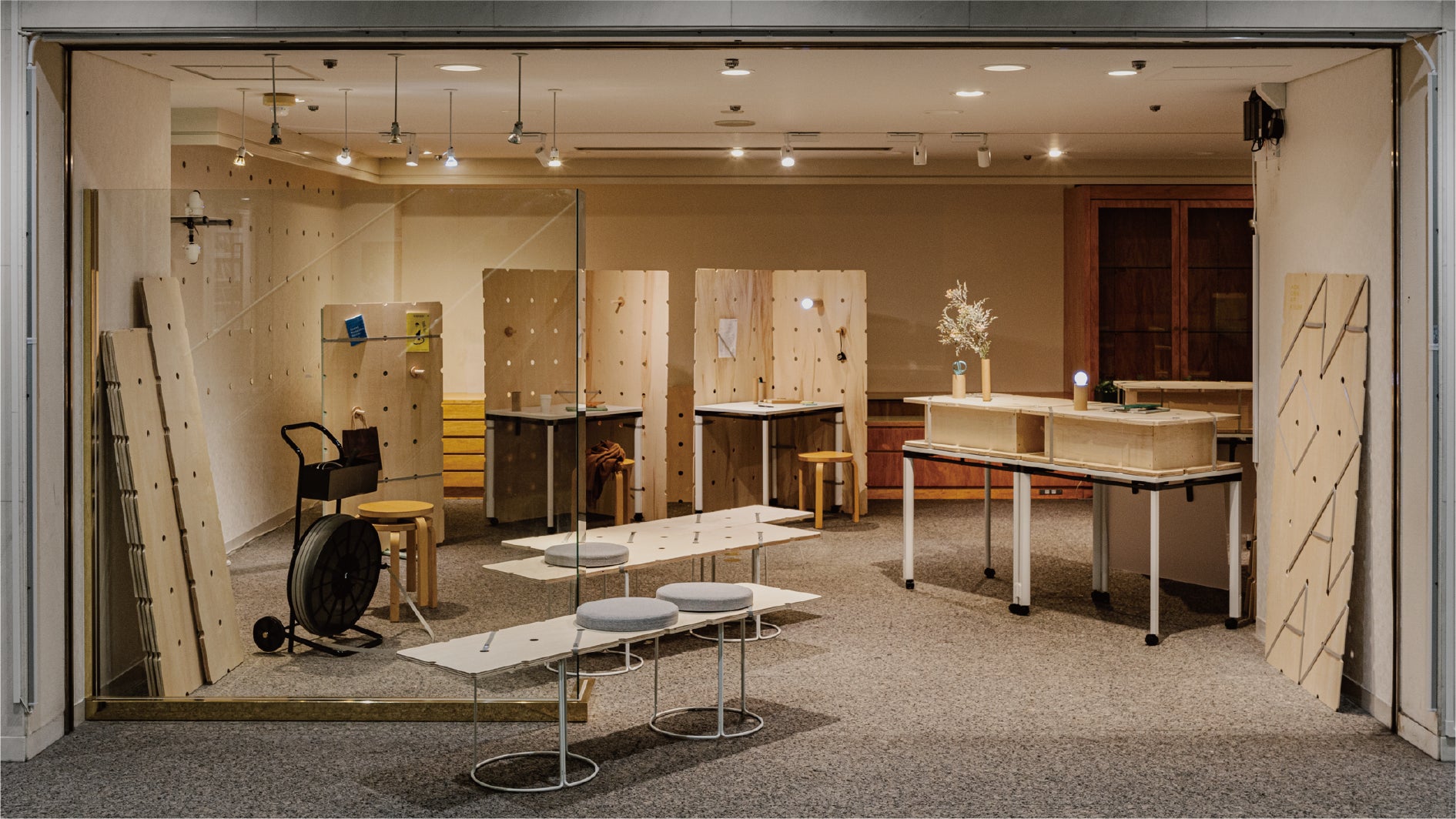愛知芸術文化センター旧アートショップ跡地が、市民の共創活動を支援する場として生まれ変わりました。均一なピッチで孔を開けた合板、PPバンド、専用の治具、この3つの要素により、元々置かれていた家具を使い手の発想に合わせて自由にアップデートできます。公共施設がより公共の場所として、市民に開かれた場所になることを目指しています。
