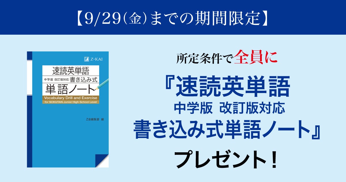 Z会では、所定の条件でお申し込みの上、アンケートに回答いただいた方全員に、Z会書籍『速読英単語 中学版 改訂版対応 書き込み式単語ノート』をプレゼントしています。
