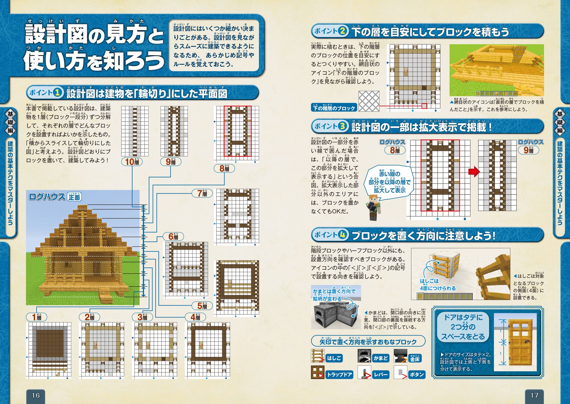 誌面では、地面の真上となる第1層、もしくは土台となる地下の第0層から順を追って最上層までの設計図を掲載。それぞれの設計図は、ひとつ前の層で置いた素材も網目で表現されており、確認しながら建築をすすめやすくなっています。