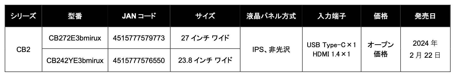 日本エイサー株式会社(本社:東京都新宿区、代表取締役社長:ボブ・セン)は、スタンダードモニターCB2シリーズより、90W給電可能な27インチモニター「CB272E3bmirux」と23.8インチモニター「CB242YE3bmirux」を、本日2024年2月22日(木)に法人市場に向けて発売します。