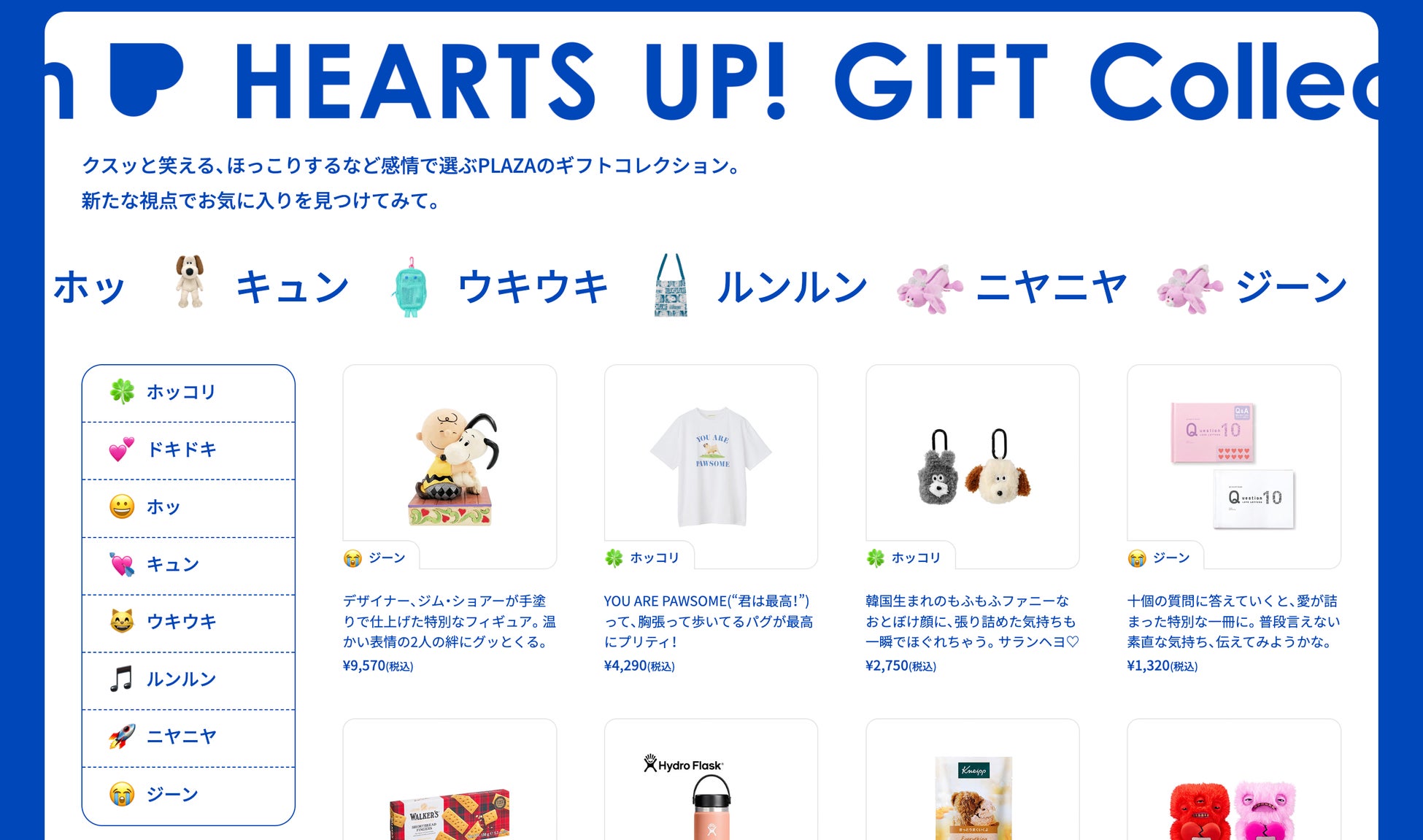 特設WEBページでは、PLAZAがおすすめするギフトアイテムを「感情別」に並べた“HEARTS UP! GIFT COLLECTION”を公開。オケージョンで選ぶギフトに限らず、ギフトを「あげる」とき&「もらう」ときのそれぞれの感情や、ギフトとなるアイテムそのものがもたらす感情に着目した、ギフト紹介コンテンツです。「ホッコリ」「ドキドキ」「キュン」「ジーン」など、8種の感情ごとにカテゴリー分けされたギフトアイテムとおすすめテキストを見ながら、相手のことを思って、ギフト探しをお楽しみください。