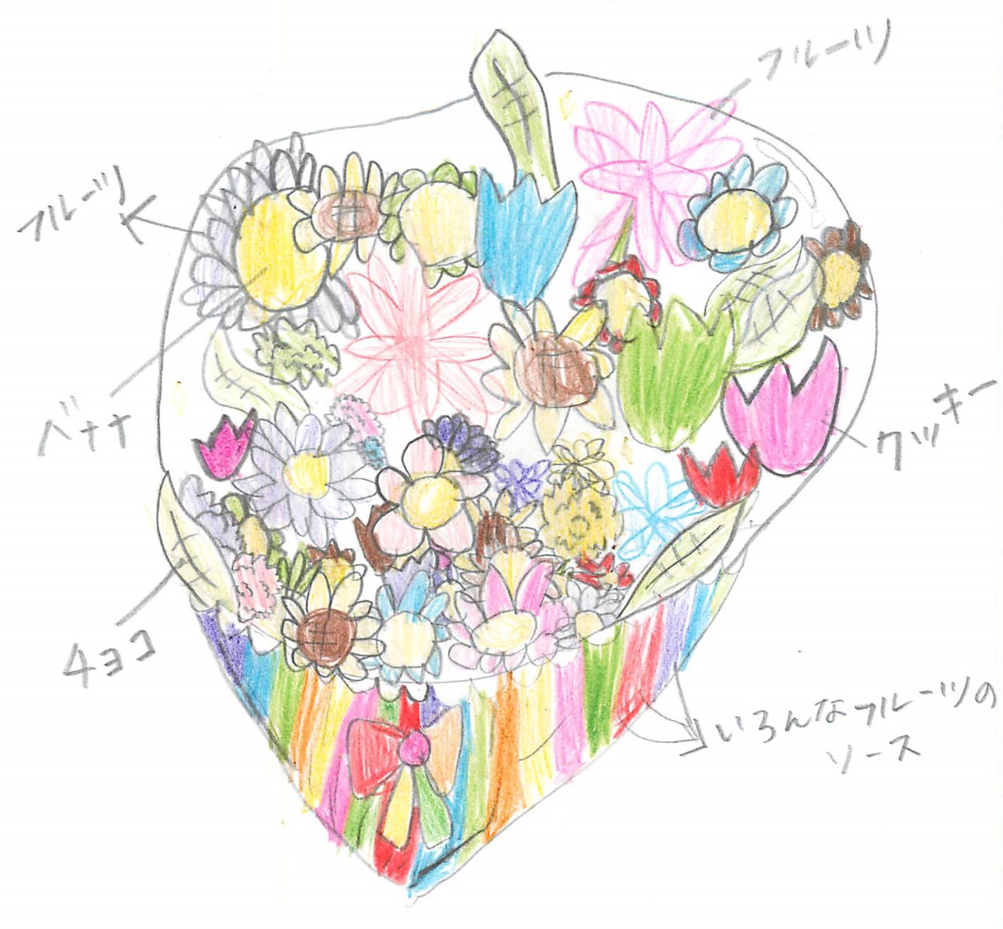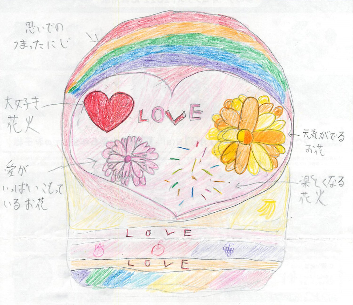 元気がでるお花は、食べたら、元気がでるようなオレンジやグレープフルーツの味がします。楽しくなる花火は、楽しくなるような花火をイメージしてかきました。