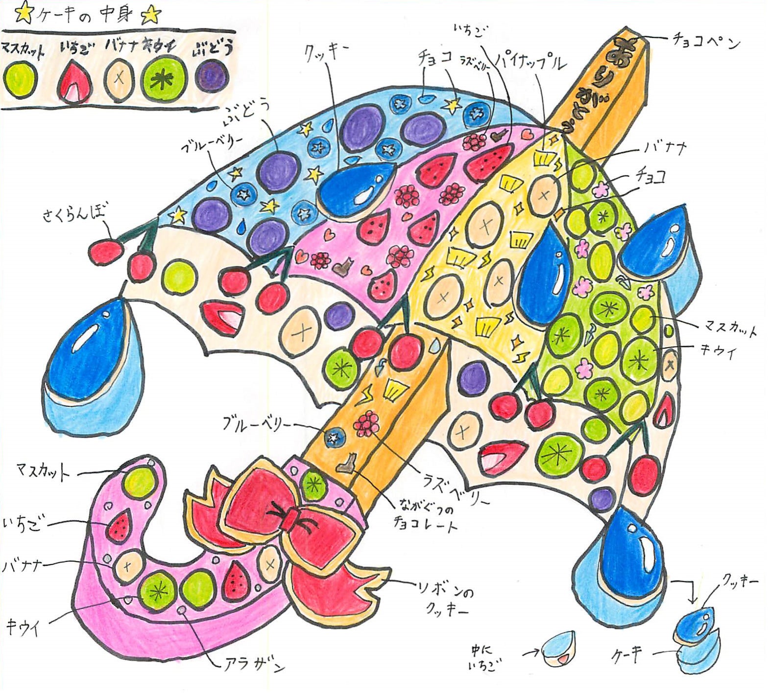 傘のぬのの部分は、左から青いフルーツ、赤いフルーツ、黄色いフルーツ、緑のフルーツをのせて、カラフルにしました。もっとはなやかになるように、星やハート、お花、雨の日のながぐつ、しずく、かみなりのチョコレートでかざりました。傘のぼうのてっぺんには、感謝の気持ちが伝わるように「ありがとう」とかきました。