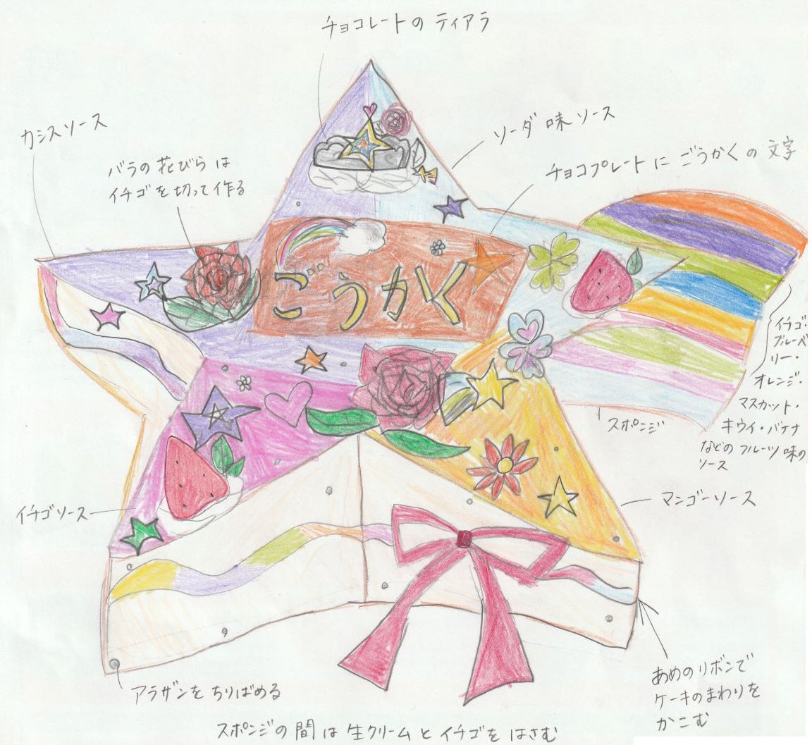 星の型のスポンジと流れ星が流れていく線のスポンジを組み合わせる。願いごとをしてから食べると叶う!!スポンジの上には、いろんなフルーツ味のソースをかける(つやつやソース)。お姉ちゃん用のティアラをかざる。プレゼントケーキなので、ケーキのまわりをあめで作ったリボンで囲んで、正面に大きな赤いリボンをかざる。