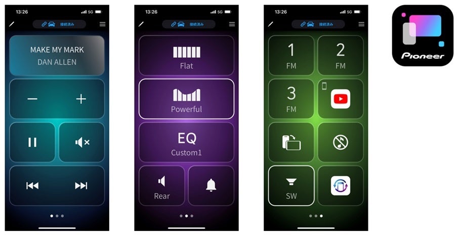 ・ 楽曲の再生/停止やイコライザー設定、FMラジオへの切り替えなど、40種類の操作キーからよく使うものを選択してスマートフォンの画面上に配置できる専用アプリ「PxLink」に対応。「Apple CarPlay」「Android Auto」の地図画面などを表示したまま、本機の多彩な機能をスマートフォンで操作できます。