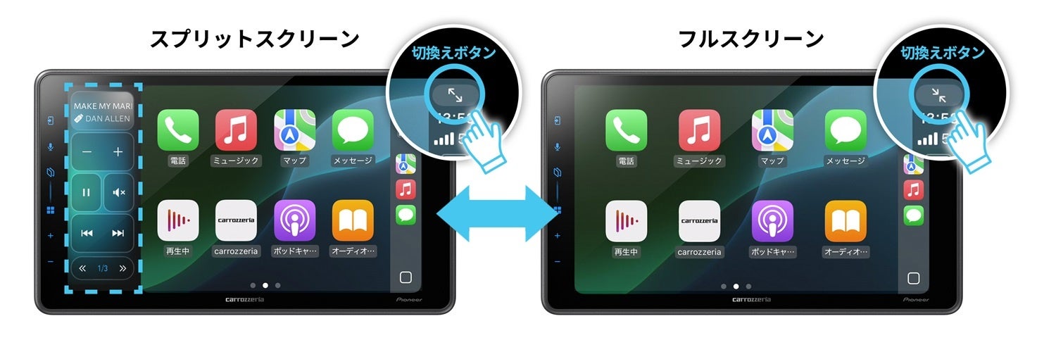 ・ 「Apple CarPlay」使用時に、本機や対応アプリを操作するショートカットキーを画面に表示する「スプリットスクリーン」を採用※2。切換えボタンをタップするだけで簡単にスクリーンモードを変更できるので、画面を遷移することなく、目的の操作をスムーズに行えます。