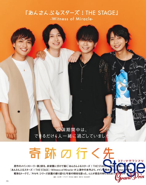 『あんさんぶるスターズ!THE STAGE』-Witness of Miracle-より、『Trickstar』の4人を演じる山本一慶さん、竹中凌平さん、松村泰一郎さん、谷水 力さんを特集。笑顔の絶えない4人の素の笑顔を切り取ったグラビアは必見!現在公演の真っ只中となる本作は、『キセキ』シリーズの完結編。インタビューは、シリーズ前編(『あんさんぶるスターズ!THE STAGE』-Track to Miracle-)の振り返りから、裏話、そして今作への自信がうかがえる座談会となった。