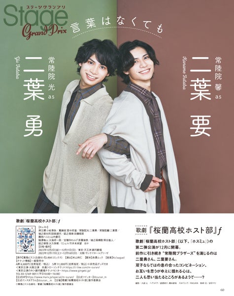 歌劇『桜蘭高校ホスト部』ƒで常陸院ブラザーズを演じる二葉 勇さん&二葉 要さんの特集。光と馨の関係が自分たちにも似ていると語るお二人に、第2弾となる今作のお話はもちろん、同じ双子だからこその役柄への思いもうかがった。グラビアは、秋色の背景のなか和気あいあい仲睦まじいツーショットになっている。