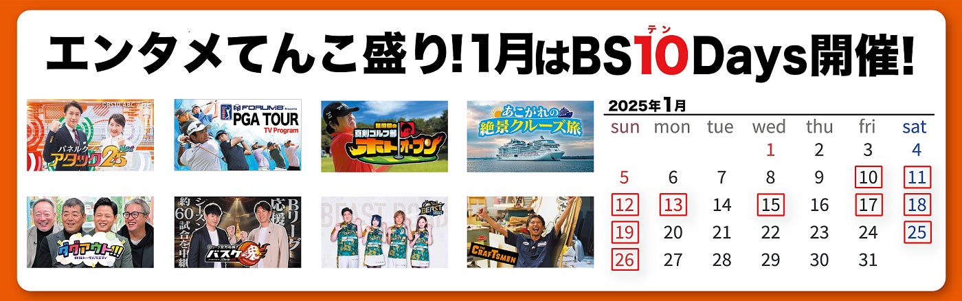 全国無料のBS放送局『BSJapanext(読み:ビーエスジャパネクスト)』は2025年1月10日にBS10へチャンネルポジションを変更し、新しく「BS10(読み:ビーエステン)」に生まれ変わります!これにあわせて、1⽉は特番編成「開局10Days」と位置づけて特別編成でお届けします。