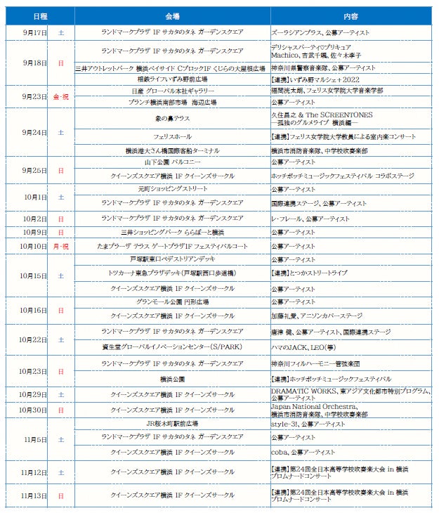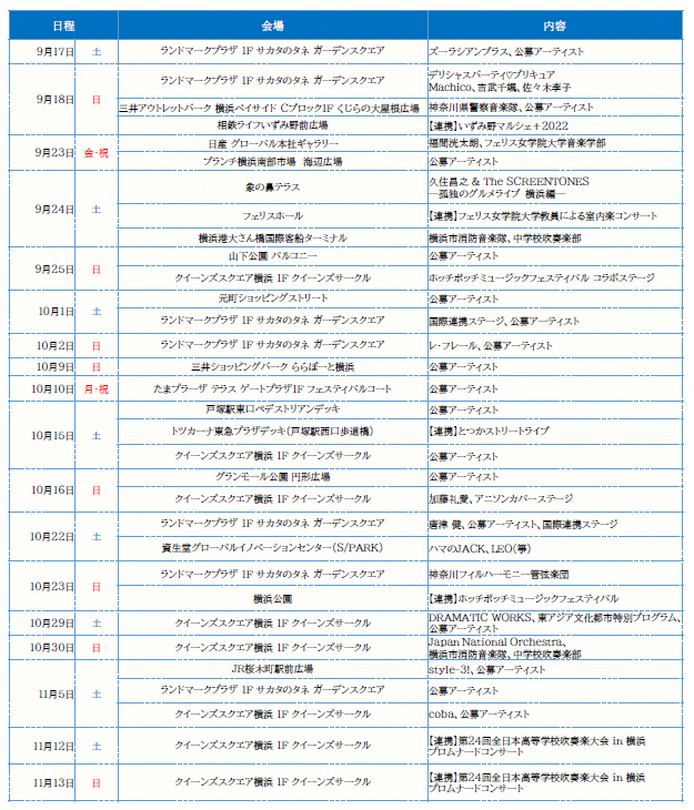 『孤独のグルメ』の原作者でもあり作曲家でもある久住昌之や世界で活躍するアコーディオン奏者cobaをはじめ様々なアーティストが横浜の街を音楽で沸かせます。