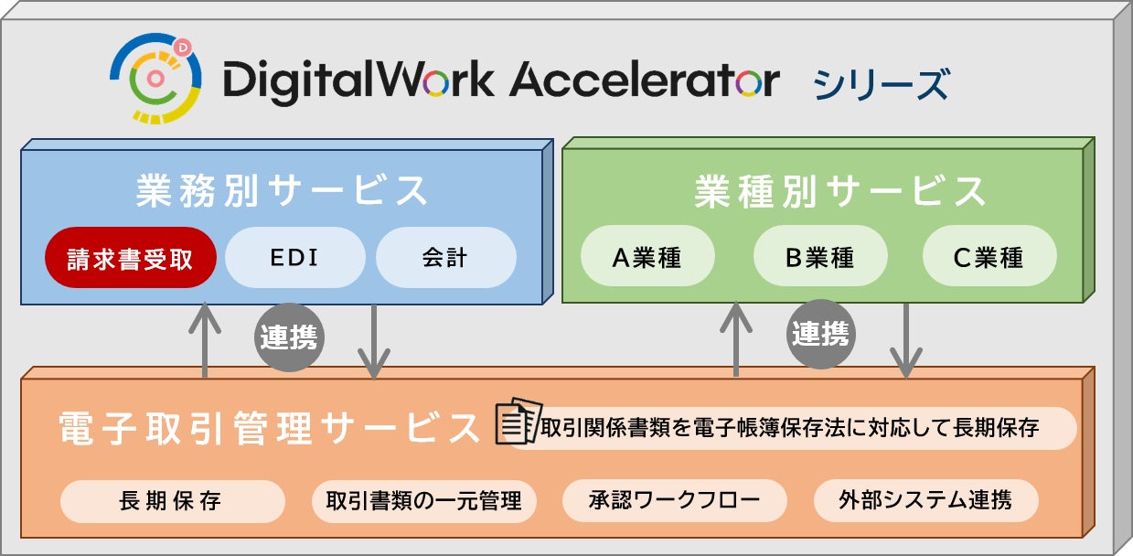 DigitalWork Acceleratorは、電子帳簿保存法に対応した電子取引管理サービスに加え、業務別アプリケーション・業種向けサービスを連携させることでDX推進と業務変革の実現を支援するクラウドサービスです。