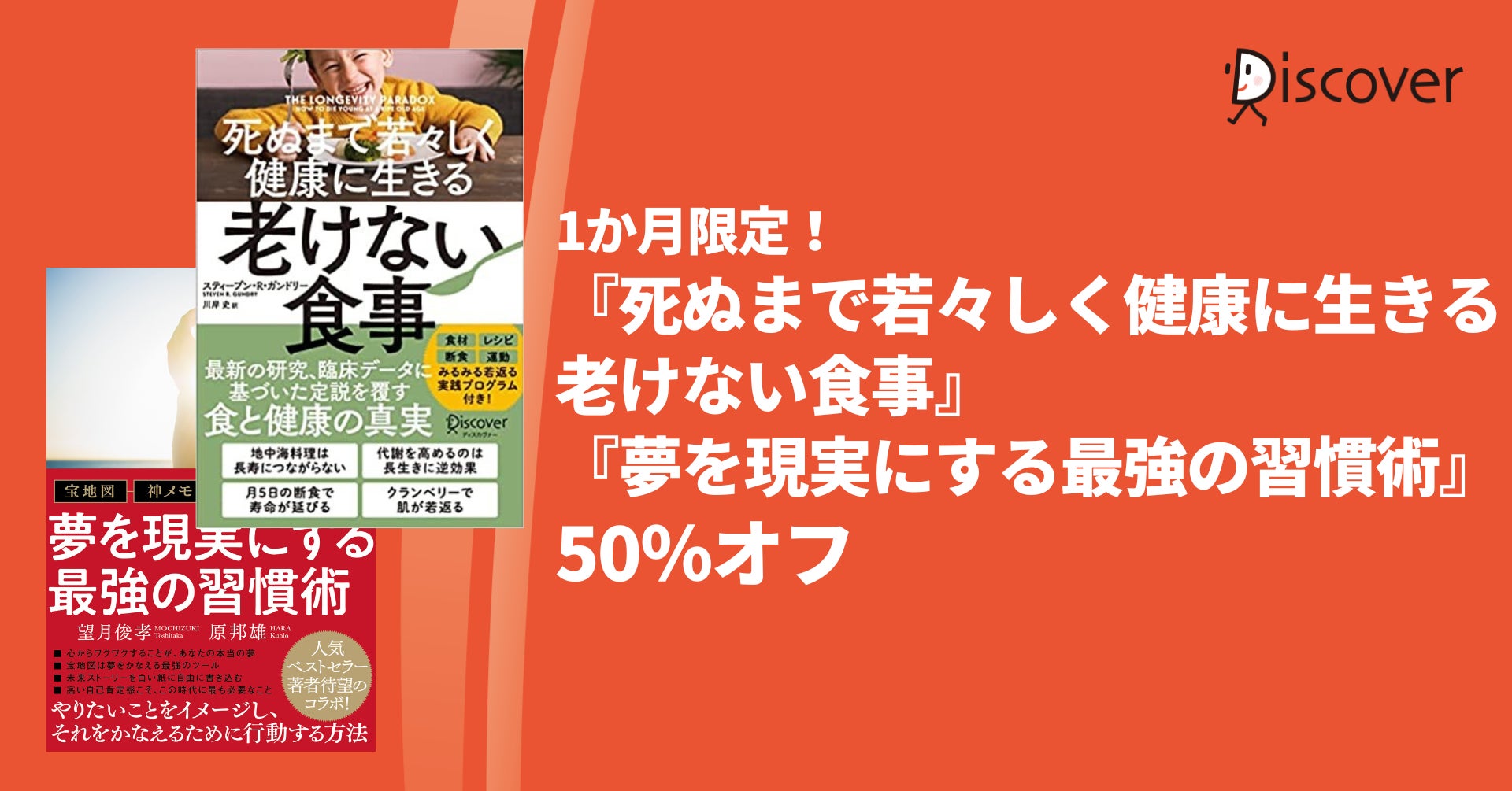 株式会社ディスカヴァー・トゥエンティワン(本社:東京都千代田区、取締役社長:谷口奈緒美)は2022年10月1日から10月31日の1か月間、Kindleにて『死ぬまで若々しく健康に生きる 老けない食事』、『夢を現実にする最強の習慣術』の2タイトルが50%オフになる割引セールを開催します。