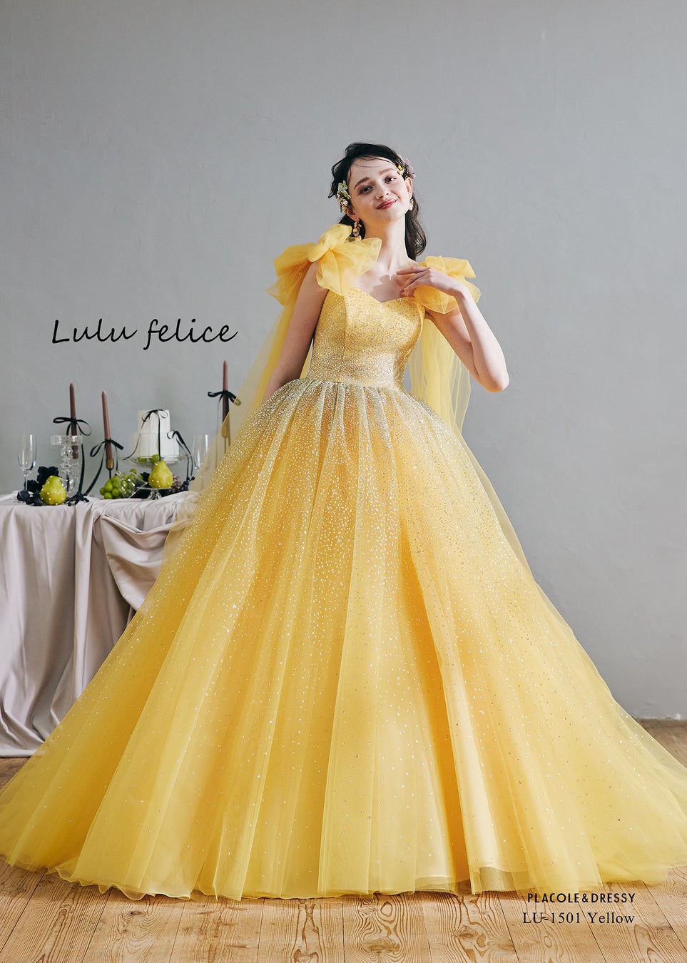 【Lulu felice(ルルフェリーチェ)】繊細なカラーリングから成す透明感。一粒から拘ったグリッターの輝きはLuluFeliceのエッセンス。纏った瞬間に心ときめく憧れの花嫁姿を叶えます。スタイリングにもトレンドを取りいれ今の時代を生きるあなたへフィットするドレスコレクション。