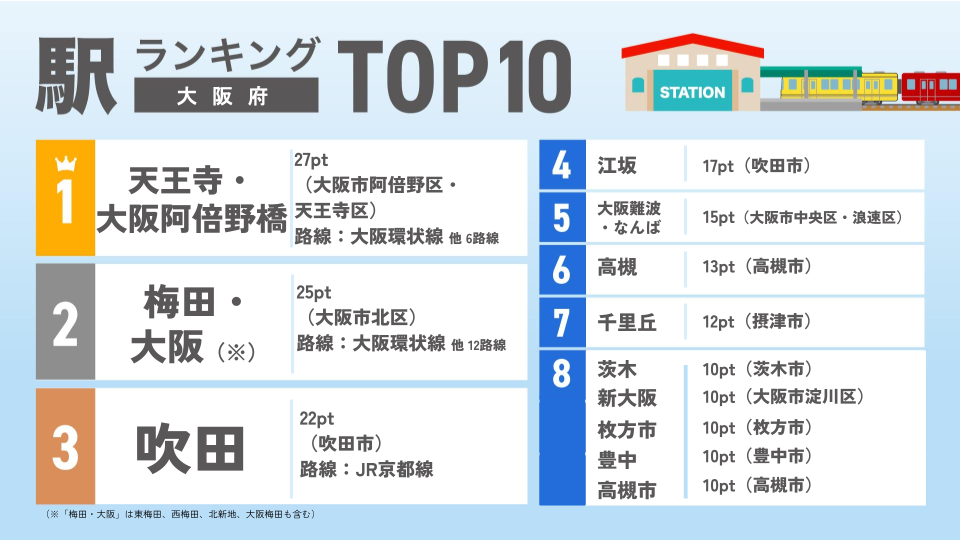 関西のトップ10は「JR新快速の停車駅」や「大阪メトロと御堂筋線沿線」の駅が数多く入っている。