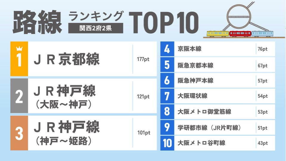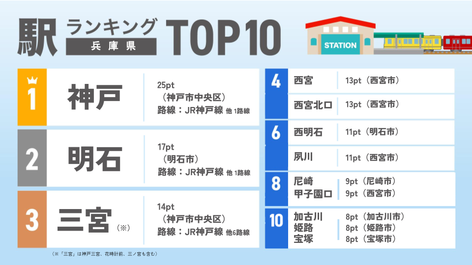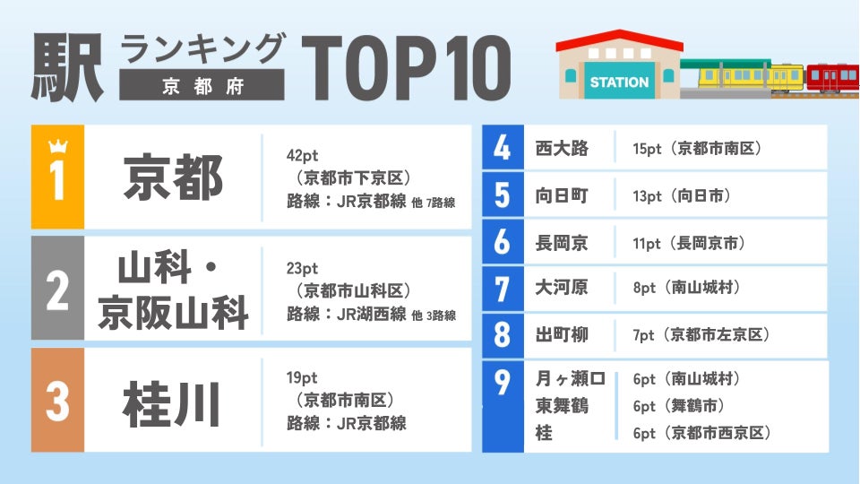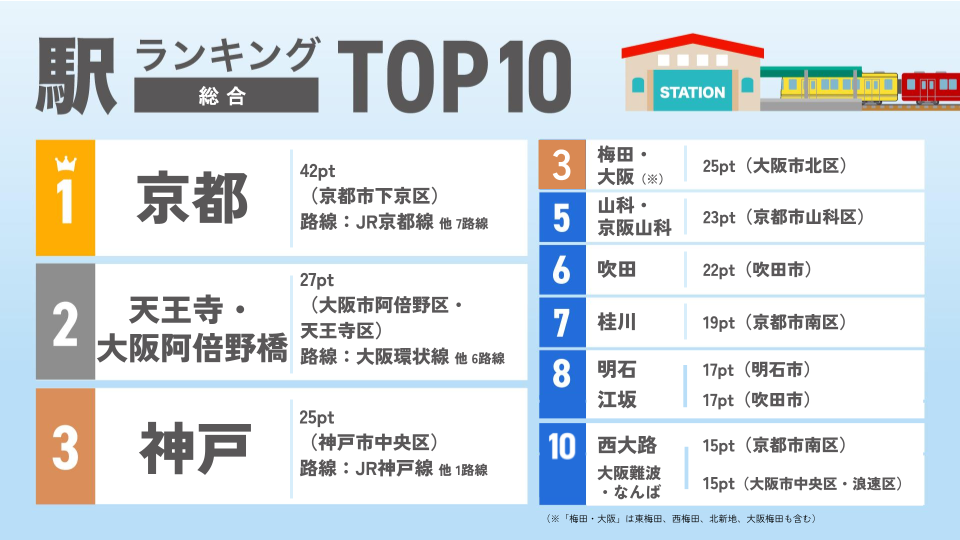 交通の要所であり商業集積地でもある京都駅が首位。新快速や快速が停車するJRの駅が多く選ばれている。