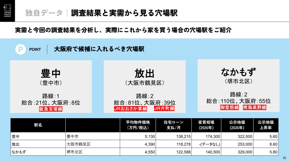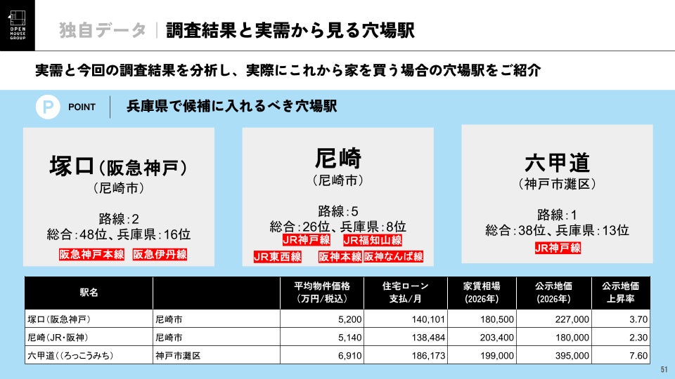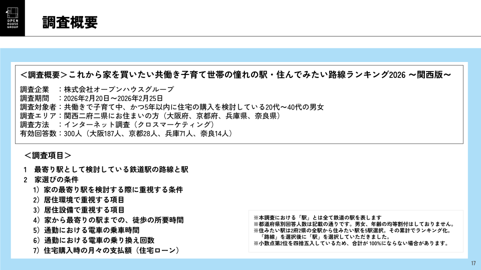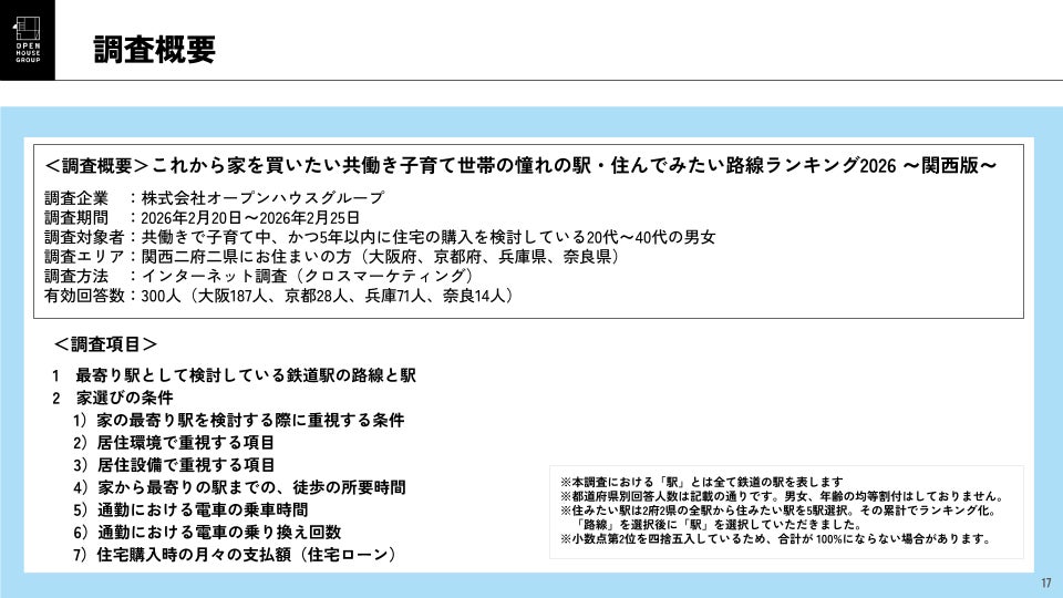 株式会社オープンハウスグループ(本社:東京都千代田区、代表取締役社長:福岡 良介、以下「当社」)は、「これから家を買いたい共働き子育て世帯の憧れの駅・住んでみたい路線ランキング2026 ~関西版~」の調査結果を発表いたしました。また、土地の仕入れから設計・建築・販売までを一貫して手掛ける「製販一体」の体制を持つ当社ならではの視点から、不動産のプロが選ぶ「これから注目の穴場駅」についても併せてご紹介しております。