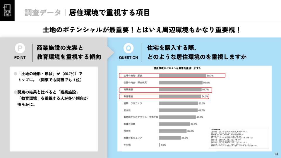 一番重視するのは「土地の地形・形状」、関東より多い「教育環境」と「商業施設」重視派