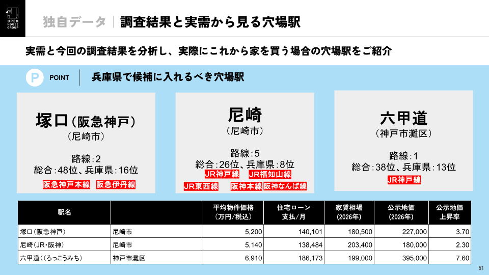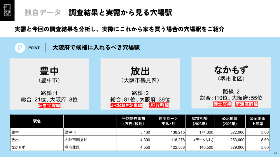 当社の実需と今回のランキング結果を受け、実際にこれから家を買う場合の穴場駅を、当社の営業拠点がある大阪府と兵庫県でピックアップいたしました。