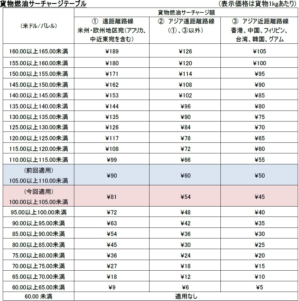 JALは日本発国際貨物燃油サーチャージの改定時期を年12回(毎月)としており、また、各月の貨物燃油サーチャージ額は「シンガポールで取り引きされるジェット燃油(ケロシン)価格の前々月の平均値」を燃油指標価格として、2022年4月より導入した以下テーブルに従いサーチャージ額を決定します。
