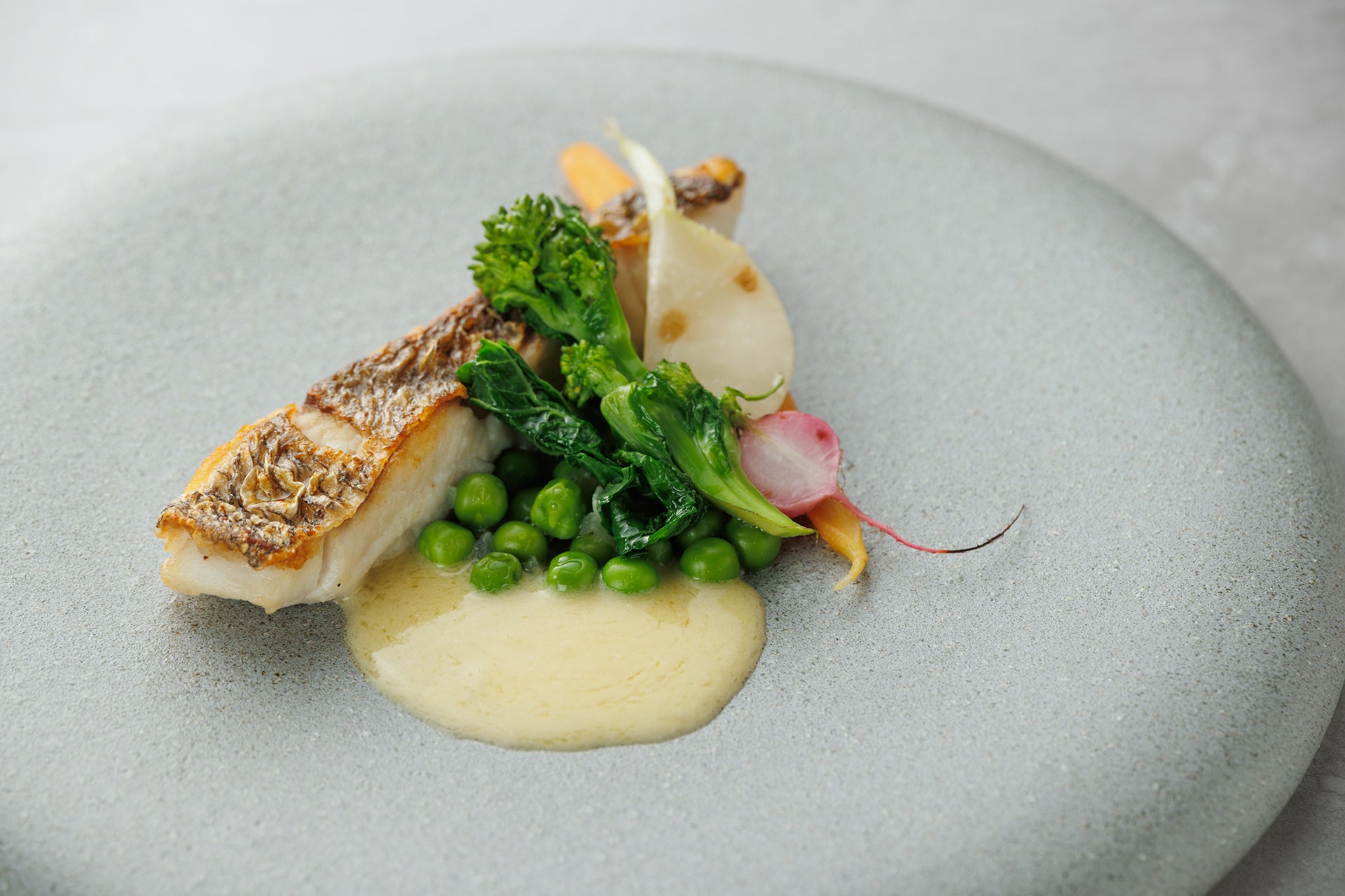 メインディッシュの一つには、フランス料理の王道である魚のポアレを春らしく真鯛でご用意。皮はカリッと香ばしく身はしっとりと仕上げ、爽やかなレモンバターソースで洗練された味わいです。