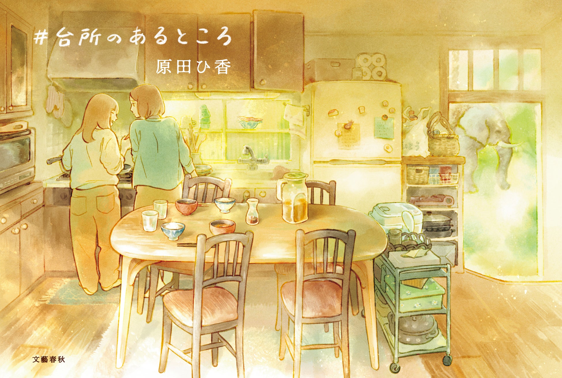 システムキッチンで料理をする2人の女性、大きな木の食卓、窓の外のゾウ...作中に登場するモチーフが細やかに描かれた装画が完成しました。