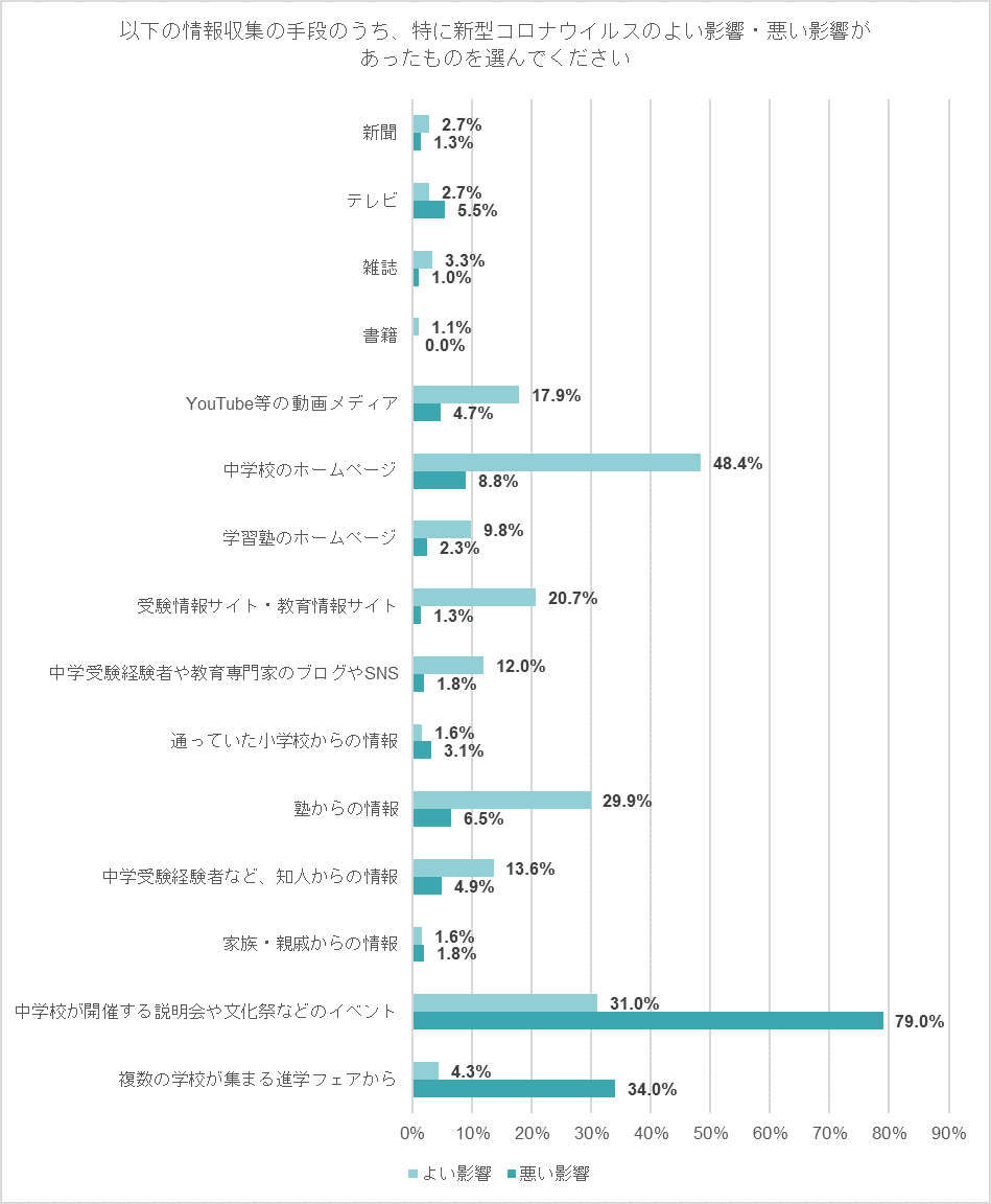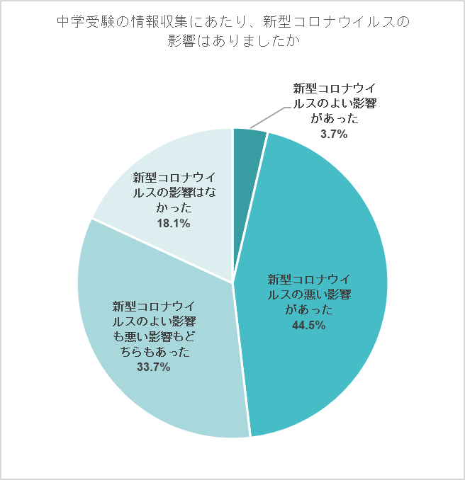 中学受験を経験した中学1年生~3年生の保護者に、中学受験の情報収集に、新型コロナウイルスの影響があったかを聞いたところ、8割超が「影響があった」と回答した。特に「悪い影響があった」と回答した人が44.5%ともっとも多かった。よい影響があった情報収集の手段は「中学校のホームページ」「塾からの情報」、悪い影響があった情報収集の手段は「中学校が開催する説明会や文化祭などのイベント」「複数の学校が集まる進学フェア」が多かった。また、コロナ下で役立った情報収集の手段は、「中学校のホームページ」「塾からの情報」のよい影響があったものだけでなく、悪い影響があった「中学校が開催する説明会や文化祭などのイベント」「複数の学校が集まる進学フェア」も3割以上の保護者が役立ったと回答した。