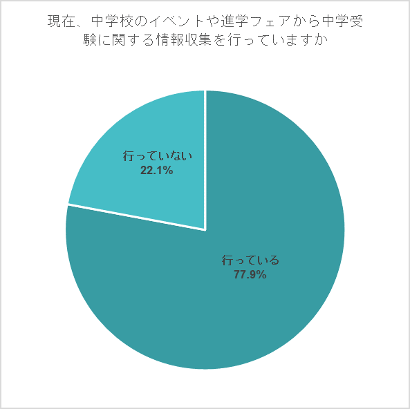 次に、【中学校の説明会や文化祭などのイベントや、複数の学校が集まる進学フェアからの情報収集】に関して、小学生保護者の77.9%が中学校のイベントや進学フェアから情報収集を「行っている」と回答した。「行っている」と回答した保護者の割合は、小学5年生で増加し、小学5・6年生では8割超となった。
