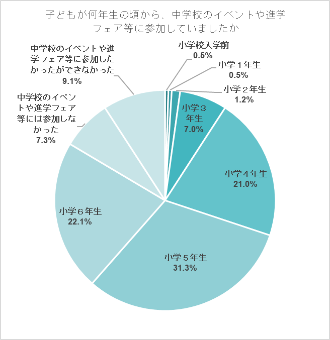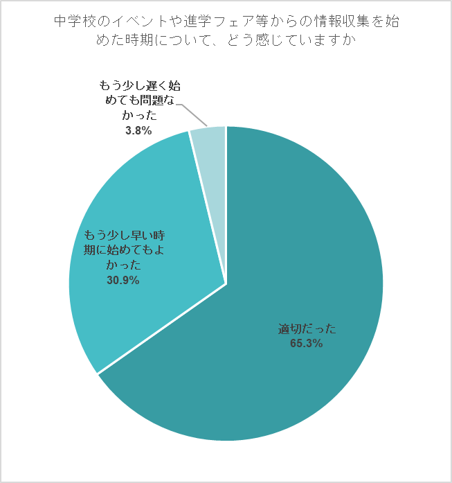 次に、【中学校の説明会や文化祭などのイベントや、複数の学校が集まる進学フェアからの情報収集】に関して、中学受験経験者の約85%が中学校のイベントや進学フェア等に参加しており、小学5年生の頃から参加していたという回答がもっとも多かった。また、「参加したかったができなかった」という保護者は9.1%だった。中学校のイベントや進学フェア等からの情報収集を始めた時期については、65.3%が「適切だった」と回答した一方、「もう少し早い時期に始めてもよかった」と回答した人は3割にのぼった。