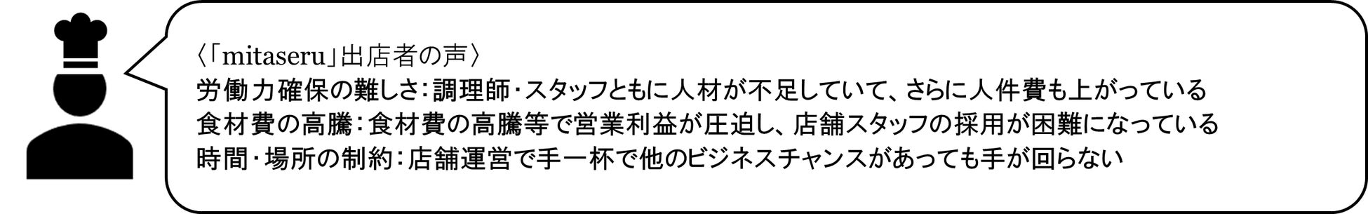 mitaseruでは、「飲食店の拡張性の課題解決」に着目した事業展開を進めています。日本の飲食事業は、世界から高い評価を受ける産業でありながら、立地や客席数といった物理的制限による売り上げの限界があり、更には人手不足という問題も重なり、「より多くのお客様に料理を届けたくても届けられない」という課題を抱えています。そこでmitaseruは、一般的なレストラン監修商品とは異なり、店舗で実際に提供されている料理と同クオリティの「再現」にこだわって、シェフととことん向き合い年月をかけて商品を開発、そのシナジーから生まれた「店舗と同クオリティのメニュー」は、コラボレーション商品とは一線を画すものとして大きな支持を得てきました。惜しまれつつ閉店した店舗のメニュー再現に取り組む「美味しいの継承プロジェクト」では、物理的な店舗がなくなった後も「レストランのあの味」を後世に残していくことを可能にするなど、飲食店の新たな形を切り開いていきました。