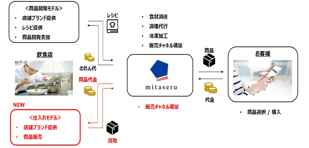 飲食店が自ら調理・凍結した商品を店舗から完全に買い取る「商品仕入れ販売モデル」をスタートいたします。既にお取り寄せ商材を製造している飲食店の中には、「販路拡大」やそれに伴う「発送業務の負担」といった課題を抱え、自店だけでは解決できないケースが少なくありません。mitaseruでは、飲食店が製造した冷凍商品を仕入れ、こうした飲食店に代わって、オンラインストアで販売、在庫保管・発送・顧客対応をすべて担うことで、飲食店の事業拡大をサポートいたします。