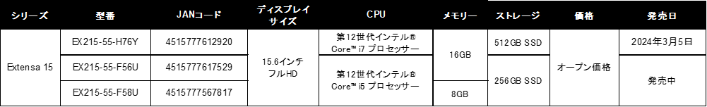 なお、Extensa 15シリーズからは、CPUにインテル(R) Core(TM) i5プロセッサーを搭載した「EX215-55-F58Uシリーズ」「EX215-55-F56Uシリーズ」を発売中です。