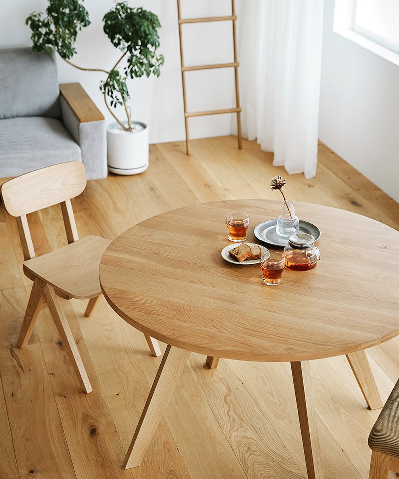 木の温もりや表情を感じていただけるようにオーク無垢材を使用したBOTHYのダイニングテーブルから新たにラウンド型がラインナップに加わります。