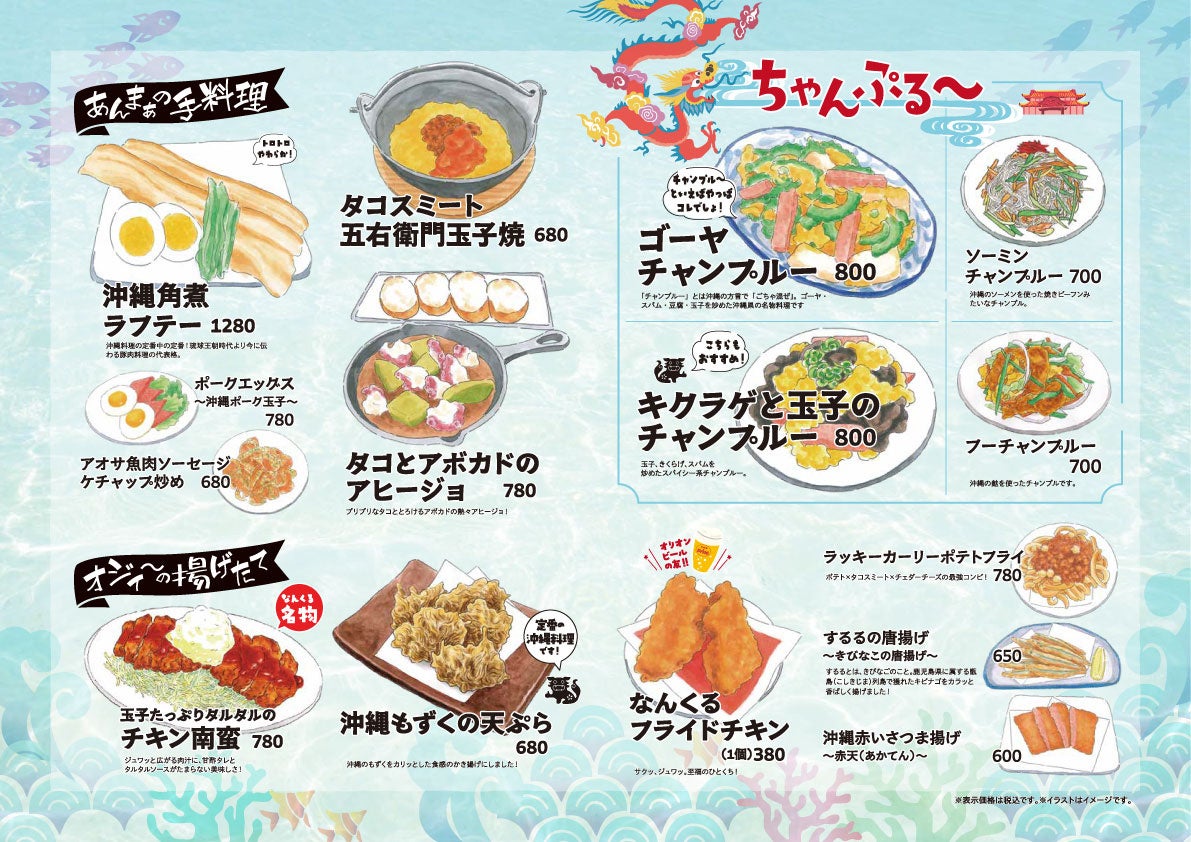 オリオンビールや泡盛とともに、ゴーヤチャンプルやラフティなど定番料理が並び、泡盛やシークヮーサー、さんぴん茶を使ったドリンクなど、南国気分を盛り上げる一杯も充実。