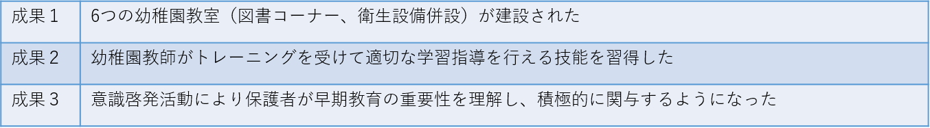 以上により、対象地域の子どもたちが、女の子も男の子も公平に、安全で快適な学習環境のもとでより質の高い早期教育を受け、初等教育へ上がる十分な準備ができるようになった。