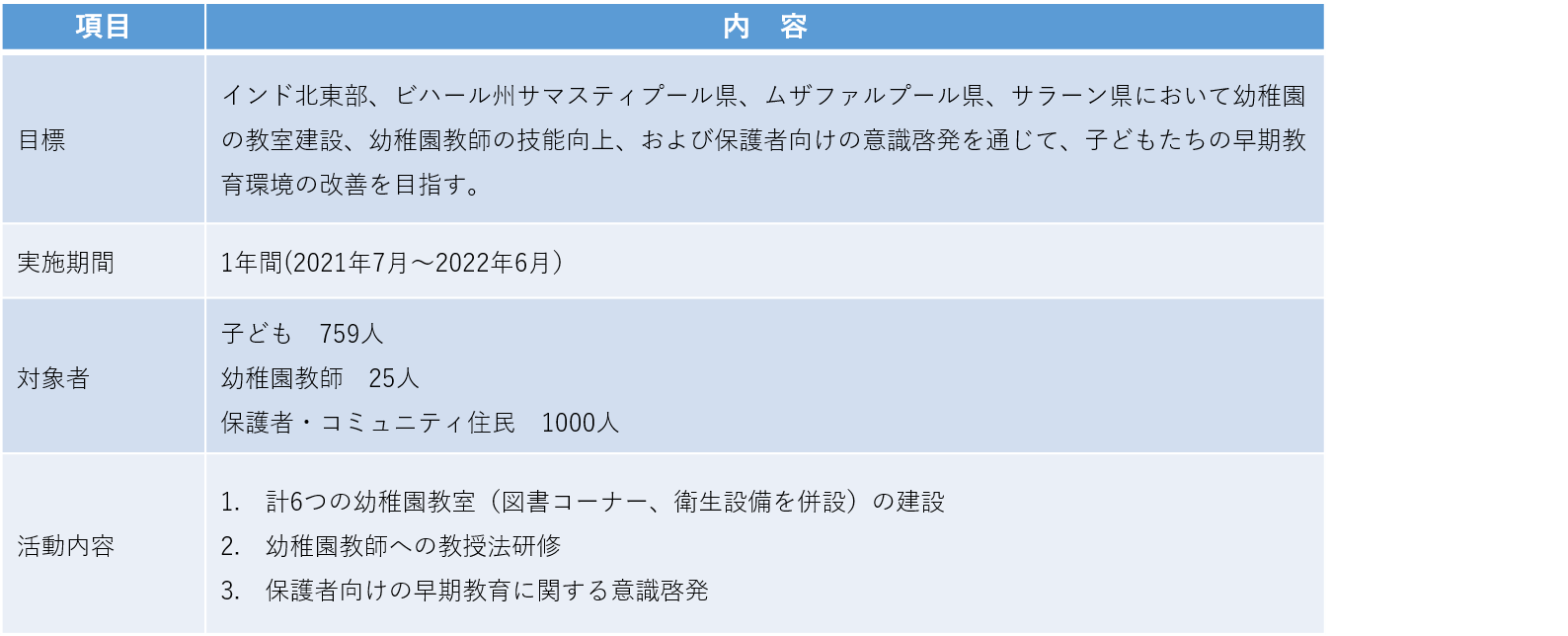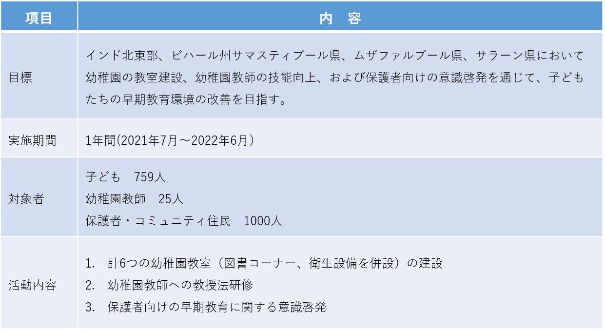 このプログラムでは、インド・ビハール州での6つの幼稚園教室(図書コーナー、トイレ・手洗い施設併設)建設、幼稚園教師の技能向上、及び保護者向けの意識啓発を通して、子どもたちの早期教育環境の改善を目指してまいりました。