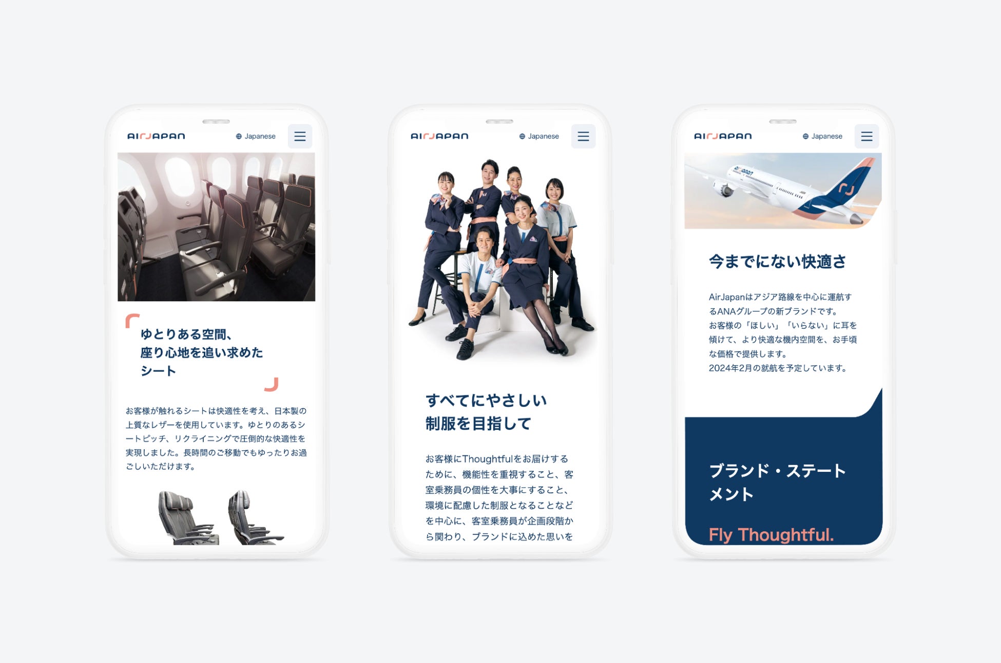 「操作性・機能性を損なわずにブランドを最大化する」をコンセプトに、UX、ウェブアクセシビリティに対応しながらも、AirJapanの世界観をUIに反映し、新しいサービス/ブランドの定着を目指しました。