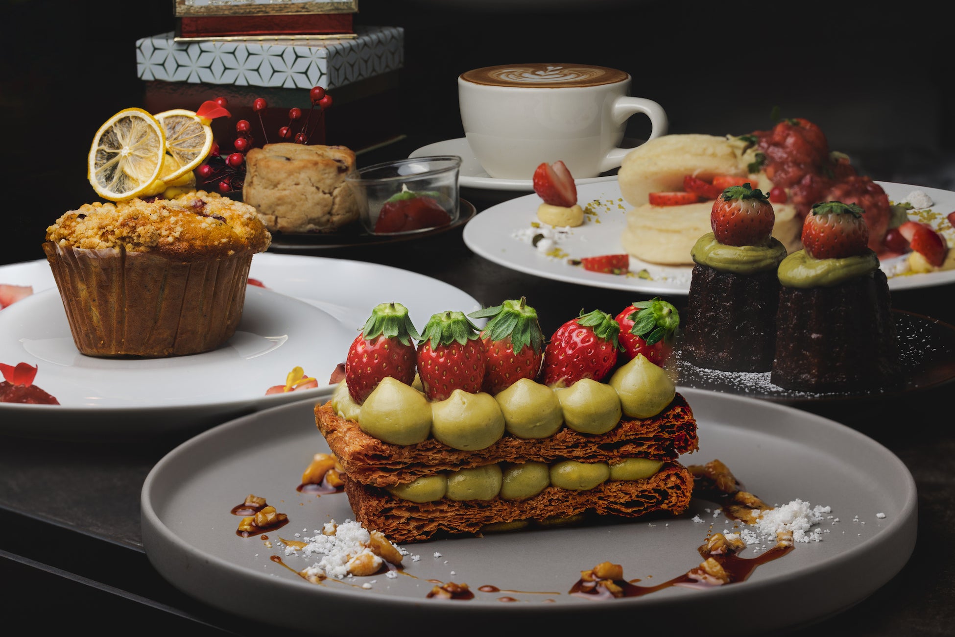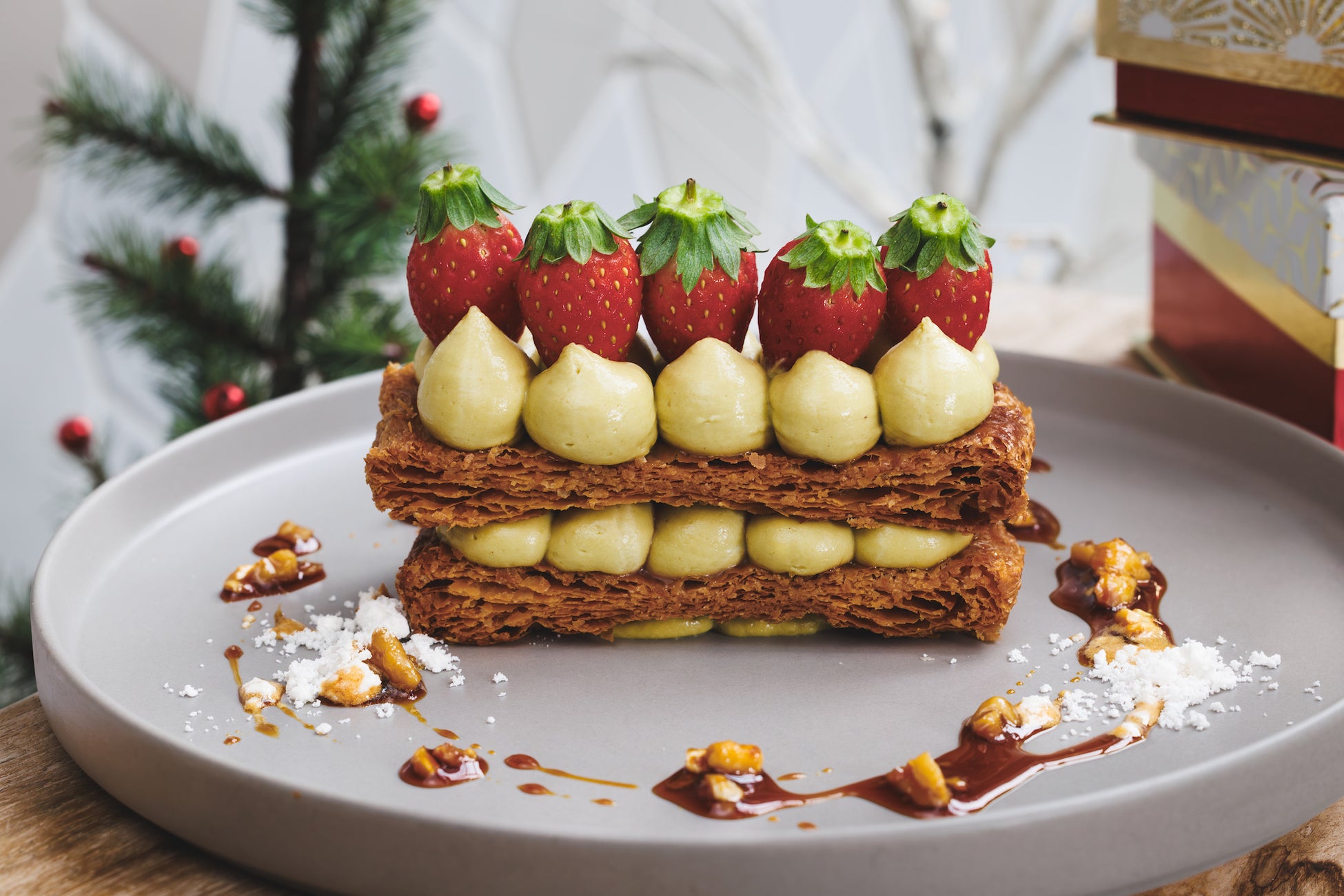 同じく人気の「季節のミルフィーユ」は、昨年も好評だったイチゴ&ピスタチオクリームのクリスマスバージョン。フワッと口溶けの良いクリームと特徴で、華やかなホリデーシーズンにぴったりな一皿に仕上げました。