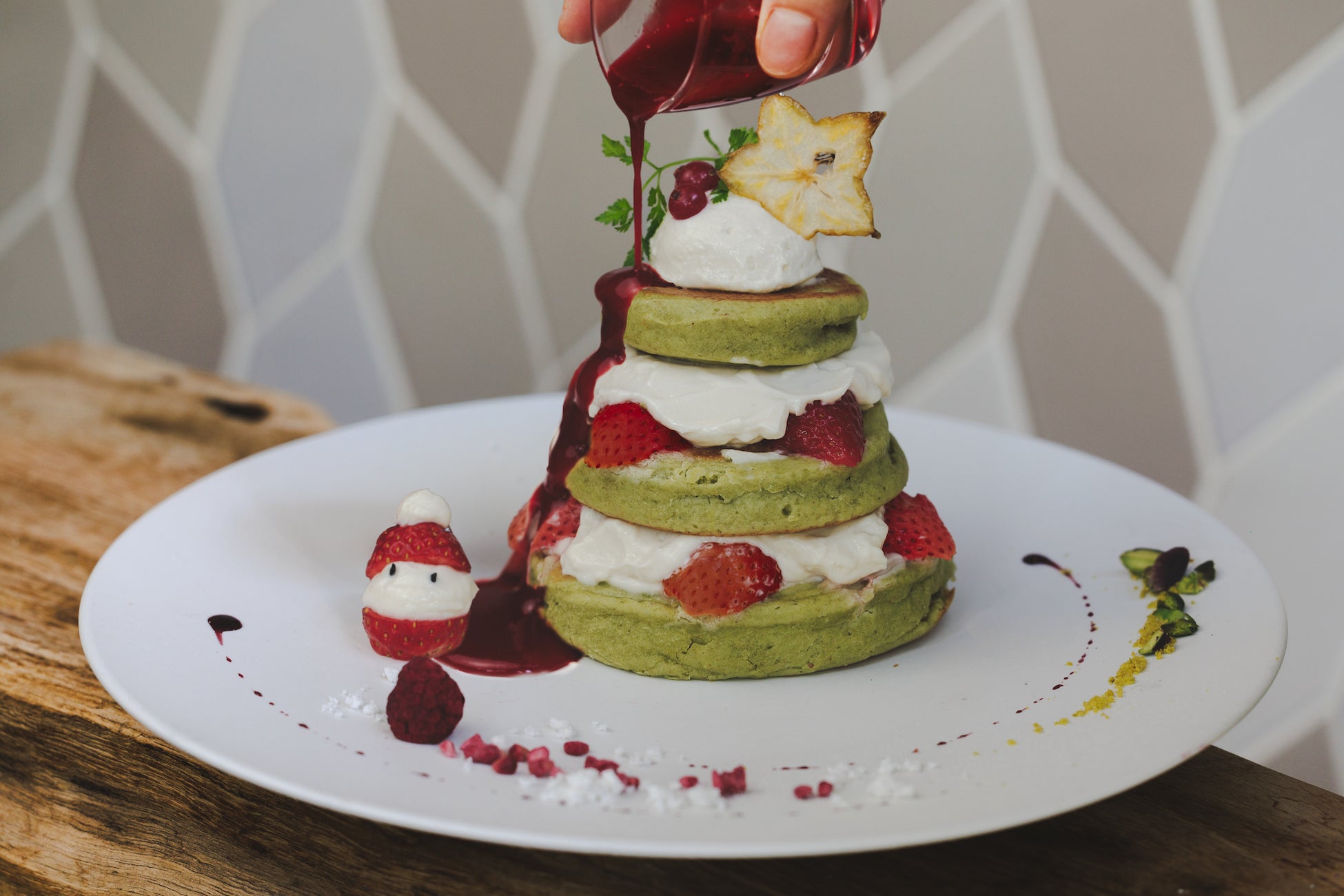 当店人気ナンバーワンの「ヴィーガン&グルテンフリーパンケーキ」の新作は、イチゴ&ピスタチオの自家製ヴィーガンパンケーキ。イタリア産の濃厚なピスタチオペーストが入ったふわふわ食感のパンケーキ生地に、マスネ社のフランボワーズリキュールが香る豆乳クリームをサンドし、国産イチゴを飾ってクリスマスツリーに見立てました。クリスマスカラーの華やかなスイーツで気分を盛り上げます。
