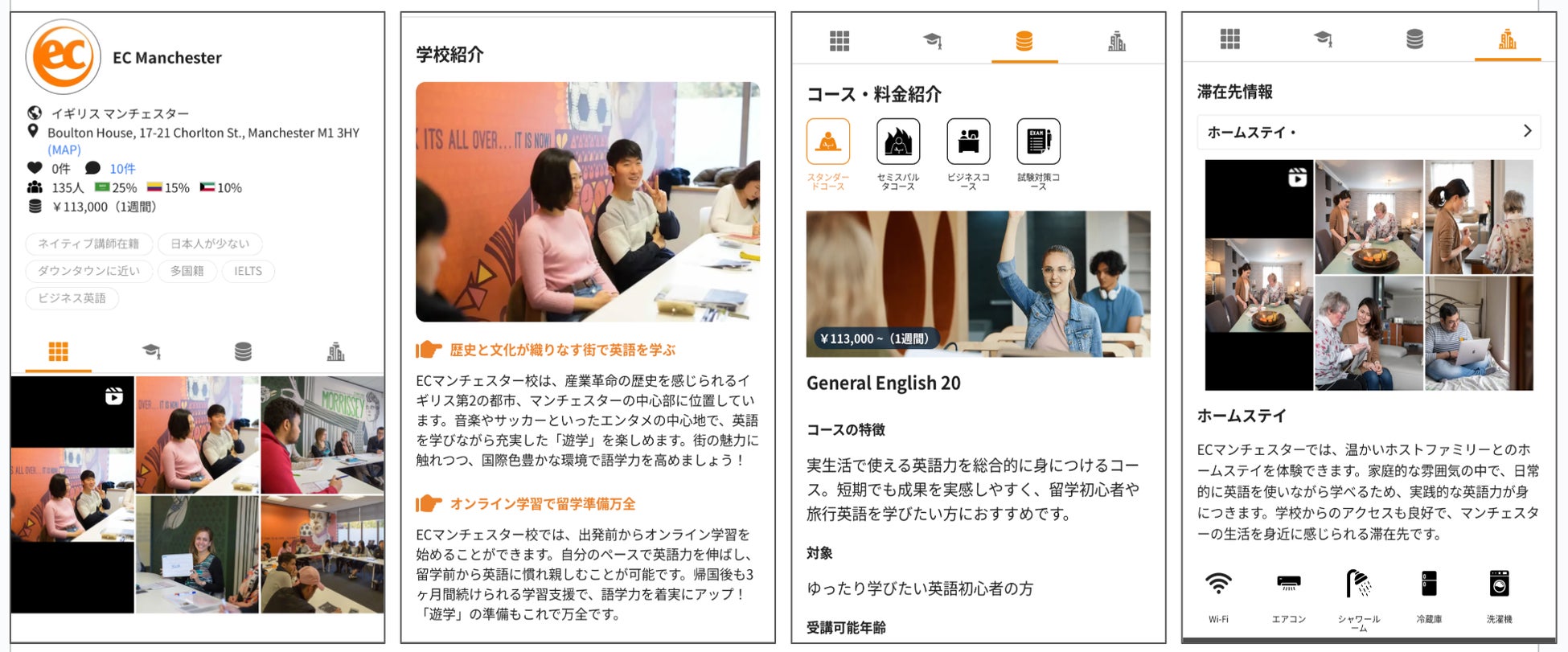 ネイティブキャンプ留学では、ユーザーが必要な情報を分かりやすく把握できるよう、常に丁寧で明確な情報提供を心がけています。EC Manchesterの詳細情報は、以下の4つのカテゴリーに分けて掲載しており、知りたい情報を的確にお届けします。