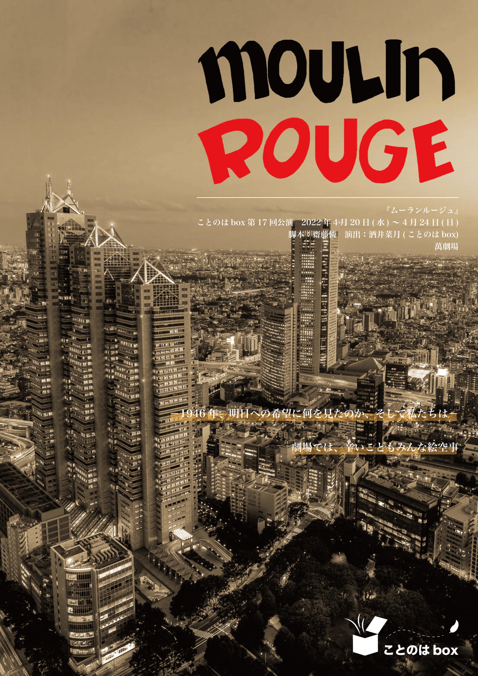 ことのはbox 第17回公演は、『上海バンスキング』で岸田國士戯曲賞を受賞し、時代の雰囲気を的確に描き出す作劇術を確立した劇作家、斎藤憐 作『ムーランルージュ』を上演いたします。戦後のままならない時代に、強く生きた人々の姿を色濃く描きます。