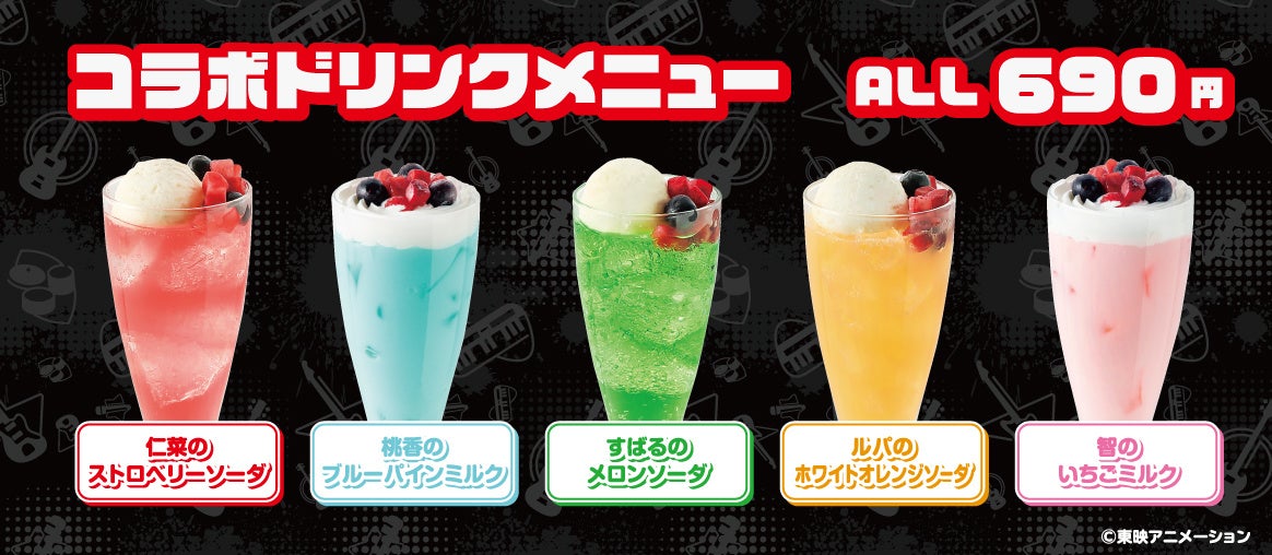 株式会社第一興商は、4月から放送されている春アニメ『ガールズバンドクライ』の作中にビッグエコーが描かれていることから、来店客に同アニメ作品の世界観を楽しんでもらうため、2024年5月3日から6月30日までビッグエコー5店舗においてコラボ企画を実施します。店頭でのアニメシーンの画像展示や、同アニメのキャラクター井芹仁菜・河原木桃香・安和すばる・ルパ・海老塚智をイメージした5種類のコラボドリンクを同期間中に販売します。