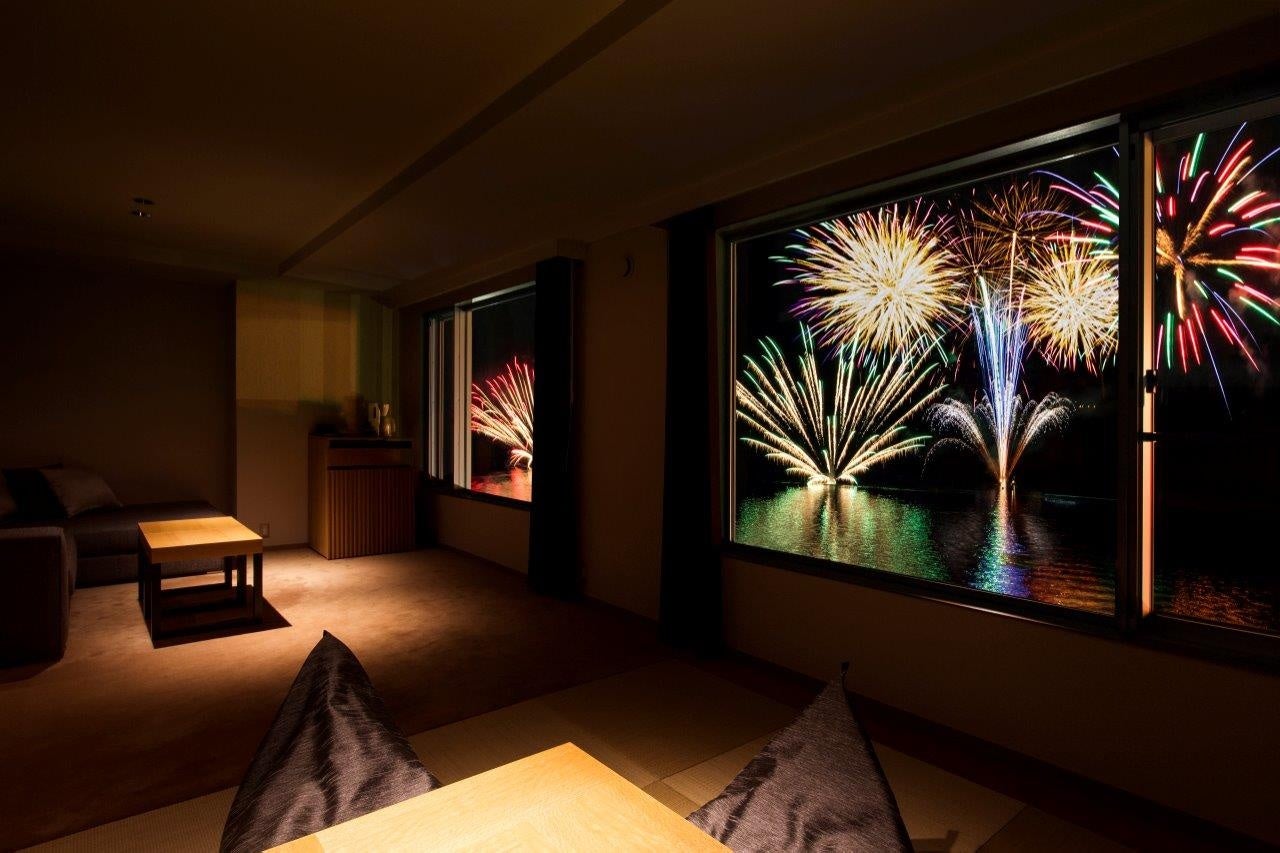 湖面にも大きく輝く花火とともに贅沢なひとときをお楽しみください。
