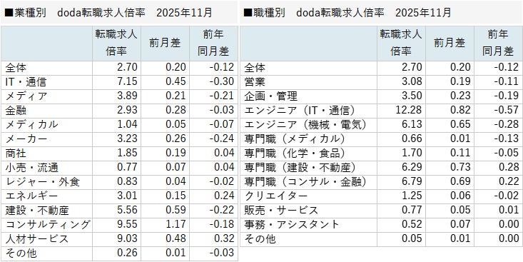 パーソルキャリア株式会社が運営する転職サービス「doda(デューダ)」(編集長:桜井 貴史)は、2025年11月の転職求人倍率をまとめた「doda転職求人倍率」を発表いたします。