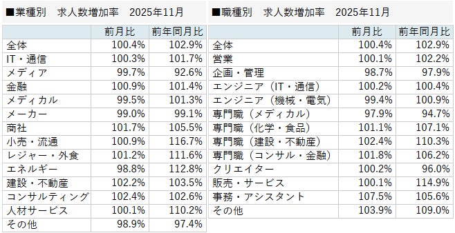 求人数は、業種別では12業種(「その他」は除外)のうち8業種で前月から増加しました。最も増加率が大きかったのは「コンサルティング」(前月比102.4%)、次いで「建設・不動産」(前月比102.2%)でした。職種別でも11職種(「その他」は除外)のうち8職種で前月から増加しました。最も増加率が大きかったのは「事務・アシスタント」(前月比107.5%)、次いで「専門職(建設・不動産)」(前月比102.4%)でした。