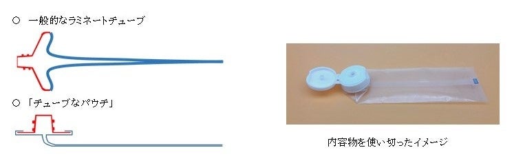 「チューブなパウチ®」は、一般的なラミネートフィルム製パウチに用いられる層構成のフィルムを筒状に加工し、先端にプラスチック成型品の注出口を取り付けた容器です。従来のラミネートチューブ容器よりも胴体フィルムの厚みが薄く、抽出口のパーツを独自開発の形状にすることで、内容物が軽い力で絞りやすく、高齢者や子供でも最後まで使い切りやすい構造となっています。また、胴体フィルムにバリア機能を付与し、内容物の品質を保持します。