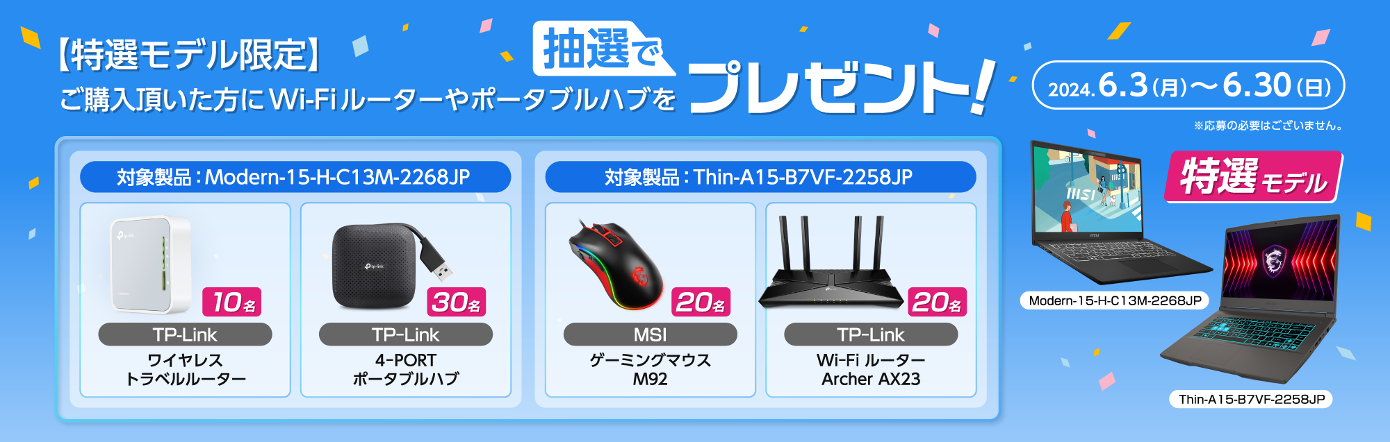 期間中、MSIストアにて対象ノートPCをご購入いただいたお客様の中から抽選で合計80名様にTP-Link製Wi-Fiルーターなどをプレゼントいたします。※4、※5